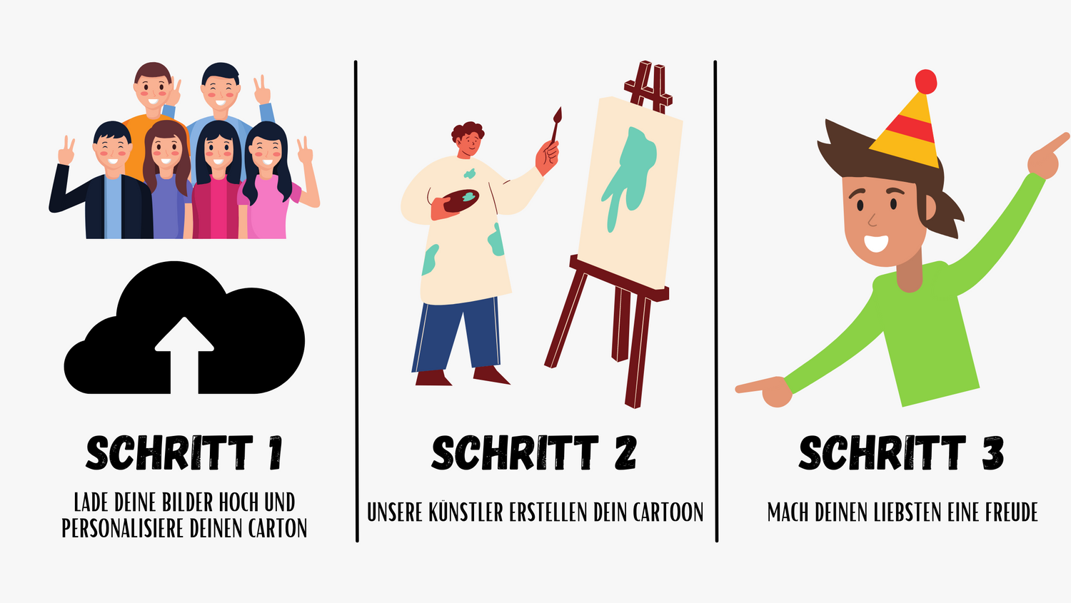 Unsere eigenen Künstler sorgen dafür, dass die Personen im Cartoon die Stars des Cartoons sind. Lade einfach deine Lieblingsfotos hoch und lass unsere Künstler zaubern.